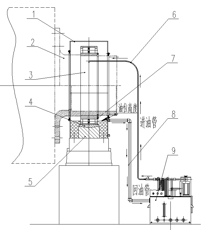 The lubrication method for the special bearings of the ball mill is shown in the figure (in the figure: 1. Upper shell of the bearing, 2. Hollow shaft of the mill, 3. Bearing, 4. Outer ring of the bearing, 5. Bearing seat). The lubricating oil pumped out of the lubricating oil station 9 is fed into the bearing through the oil inlet pipeline 6 through the oil hole on the outer ring of bearing 3, which not only lubricates the bearing balls but also takes away the heat and dust generated during the rolling of the bearing balls, The lubricating oil returns to the lubrication station 9 through the return pipeline 8, achieving the circulation of lubricating oil. To ensure that the failure of the lubricating oil station does not affect the normal lubrication of the bearing in the short term, the oil return port is opened higher than the lower ball of the bearing, ensuring that the oil level when the lubricating oil station stops working is not lower than half of the lower ball of the bearing, so that the ball that turns to the lower part can achieve effective lubrication.